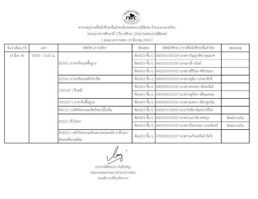 : ประกาศรายชื่อนักศึกษาสอบกรณีพิเศษปลายภาค ภาคการศึกษาที่ 2 ปีการศึกษา 2568